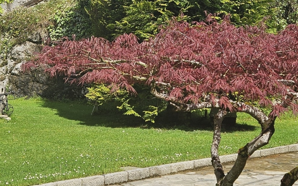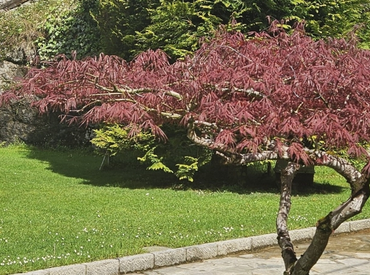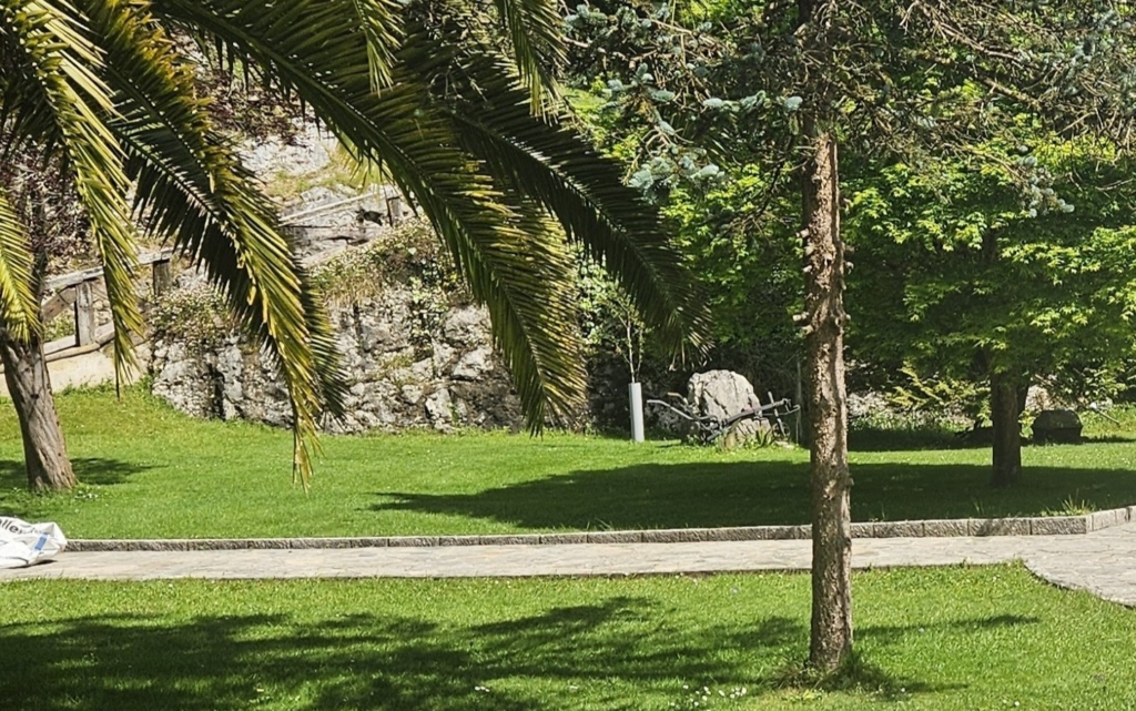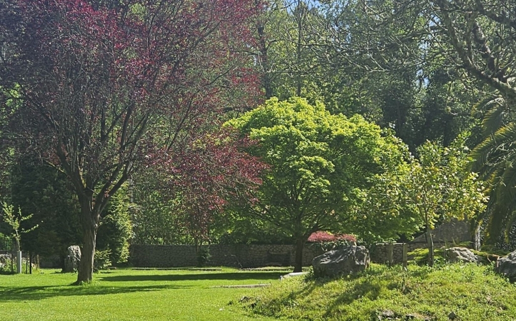 Amplios espacios exteriores con zona de parking, jardín privado y variedad de árboles 🌳.